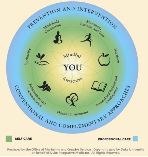 If you think about the main areas of your life like sections of a wheel, as in the example of the Wheel of Health (to the right) created by Duke Integrative Medicine, you can see that when one or more parts are out of balance, it will impact all the other areas.